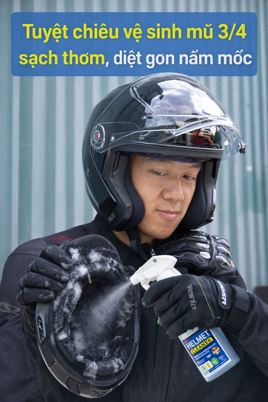 Vệ sinh mũ bảo hiểm 3/4 đúng cách giúp khử sạch mùi hôi, diệt nấm mốc hiệu quả và giữ mũ luôn bền đẹp, an toàn cho sức khỏe khi sử dụng hằng ngày.